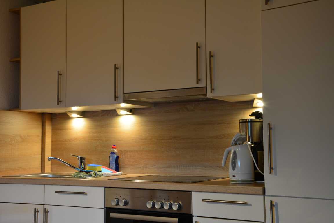 Neue Küchenzeile mit Kühlschrank, Gefrierfach, 4-er Cerankochfeld, Backofen, Geschirr, Wasserkocher, Kaffeemaschine
