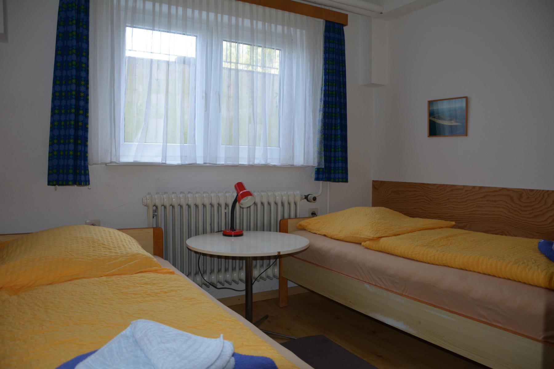 Schlafzimmer mit 2 Einzelbetten, Kleiderschrank und Babybett